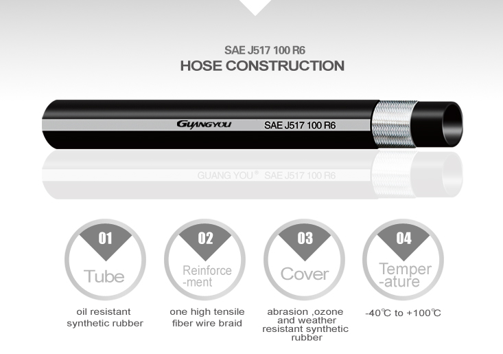 Hydraulic hose: oil resistant synthetic rubber, one high tensile fiber wire braid